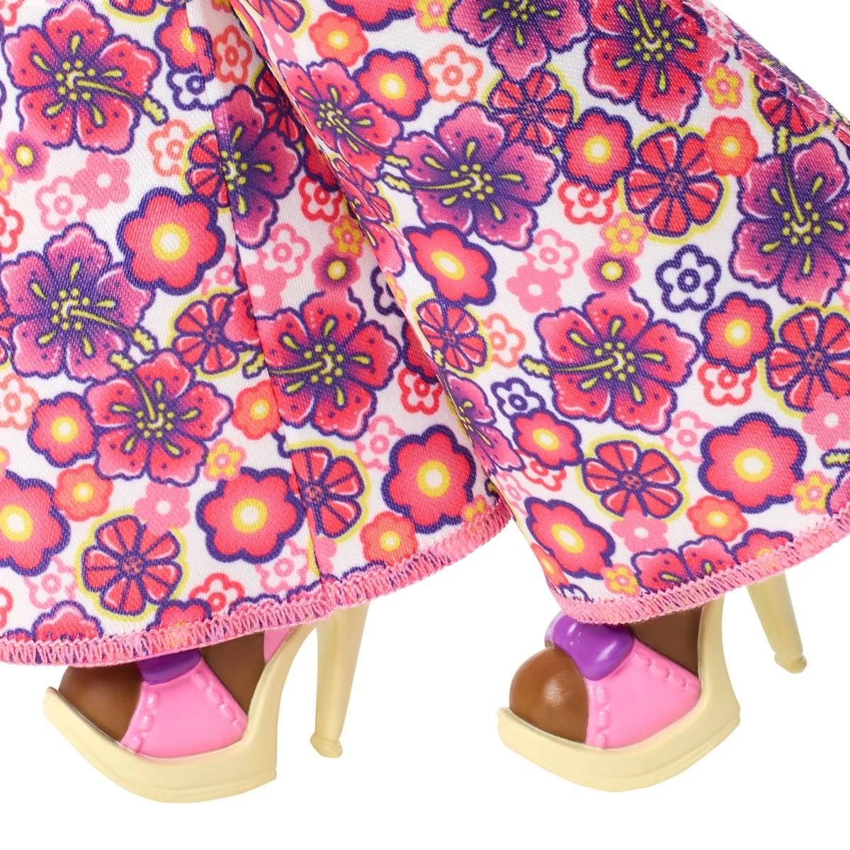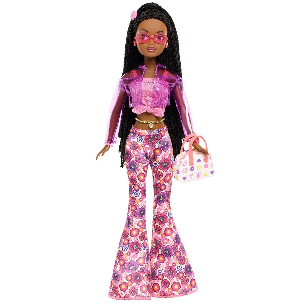 Bring back the iconic Y2K vibes with the Barbie My Scene Jai Doll, a stunning tribute to the fashion-forward My Scene dolls that defined a generation. Dressed in a shiny cropped tie top and hibiscus flare pants, Jai radiates sunny, playful energy. A translucent vinyl jacket, long black microbraids, and chunky earrings complete her look, while accessories like tinted sunglasses, a golden belly chain, stacked bracelets, and a cute handbag add extra flair.
