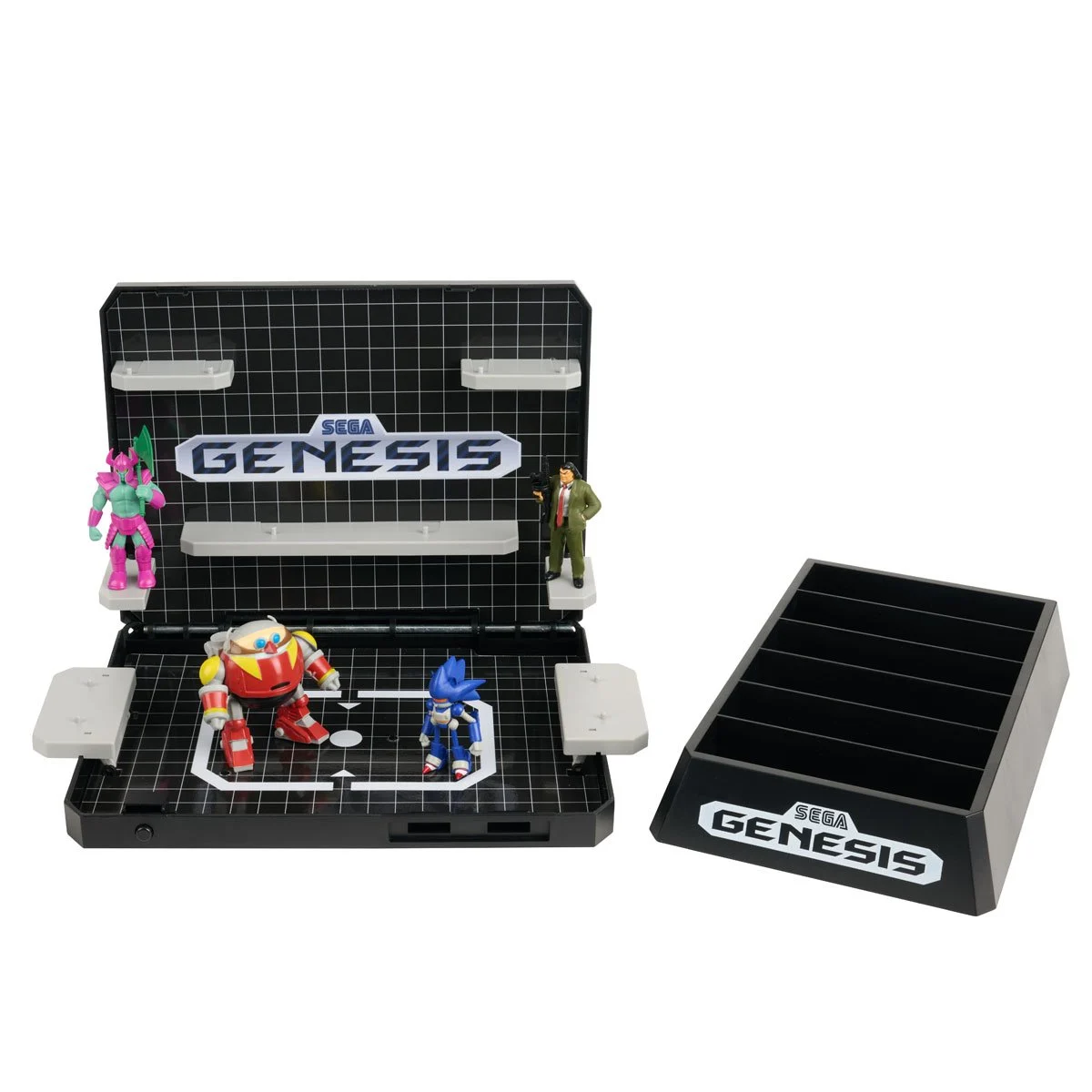 Designed to look like the classic Sega Genesis console, this diorama playset flips open to reveal retro-styled shelving and gridline deco sticker graphics, perfect for displaying your favorite villains. The bundle includes Mecha Robotnik, Mecha Sonic, Mr. X, and Death Bringer figures, with extra space to expand your Console Heroes collection.