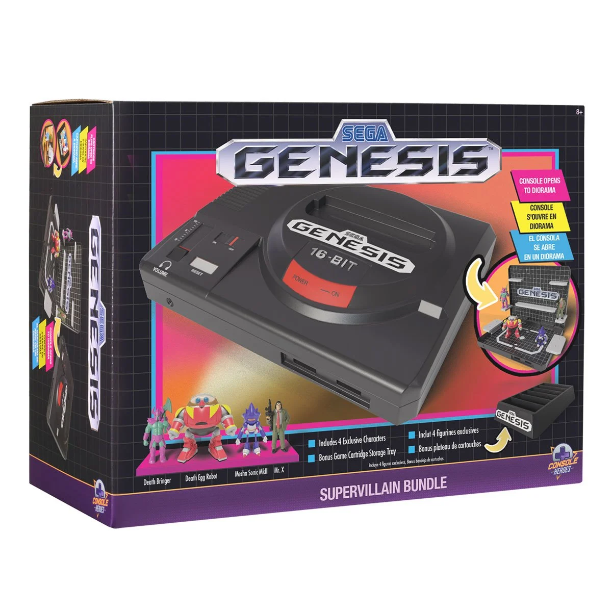 The Console Heroes Sega Genesis Boss Bundle Playset includes Mecha Robotnik, Mecha Sonic, Mr. X & Death Bringer with a retro console display and cartridge storage tray. Ages 8+.