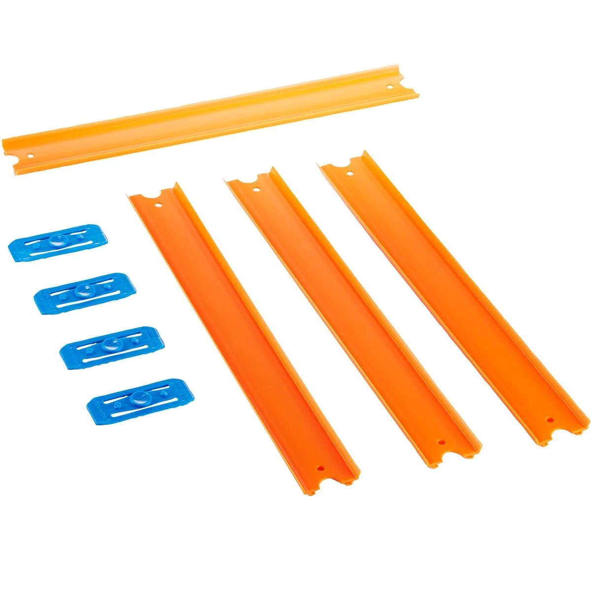 Each pack includes several straight track pieces plus four connectors, making it easy to snap layouts together. In addition, three bold color options—classic orange, black with orange stripe, or yellow with orange stripe (each sold separately)—let kids mix and match to create eye-catching courses.