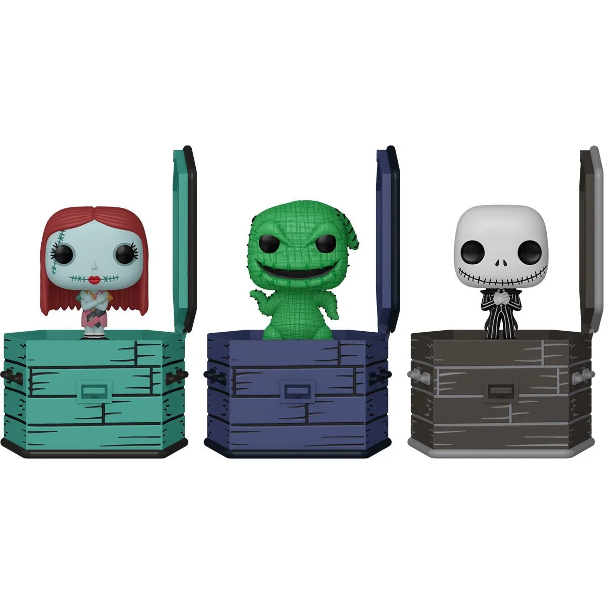 Unbox spooky surprises with The Nightmare Before Christmas Coffin Pocket POPper Mini-Figure Display Case of 12! Includes Jack, Sally, and Oogie Boogie in coffin packaging.