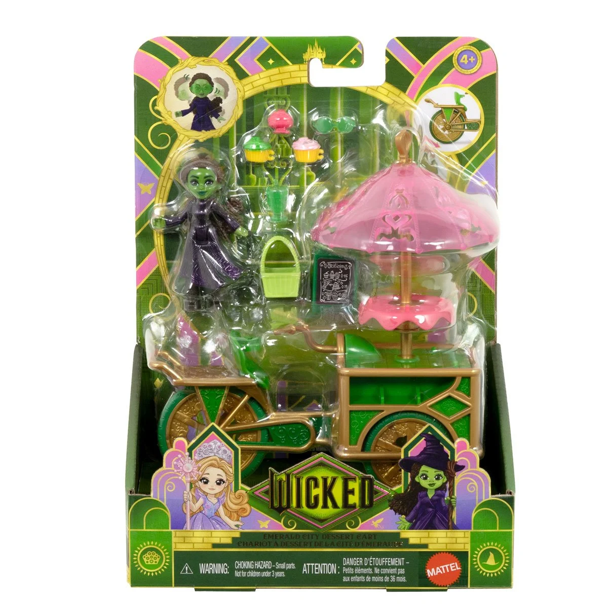 The Wicked Emerald City Dessert Cart Playset includes a 2 3/4-inch Elphaba doll, rolling dessert cart, and 7 themed accessories for magical Oz adventures.