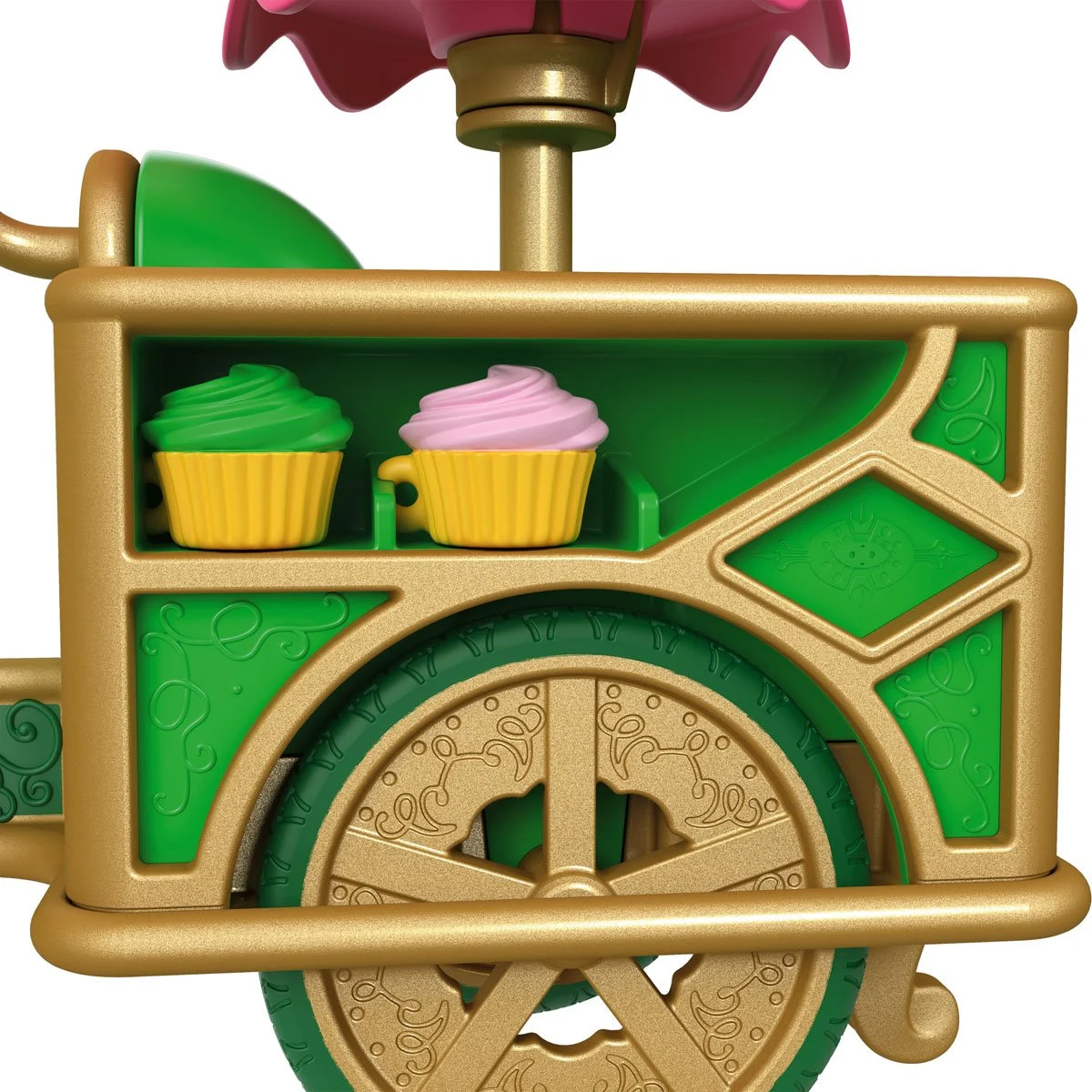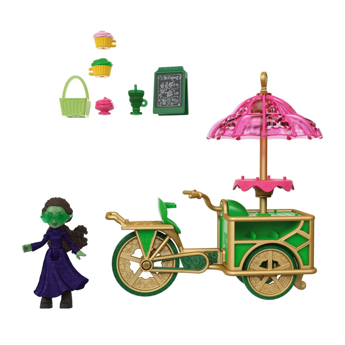 Kids can push Elphaba’s dessert cart through the bustling streets of Oz, serving cupcakes, ice cream, smoothies, and more to fellow Ozians. The cart includes realistic play areas to store and display treats, plus accessories like a menu sign, sunglasses, and a basket to make Elphaba’s adventure complete.