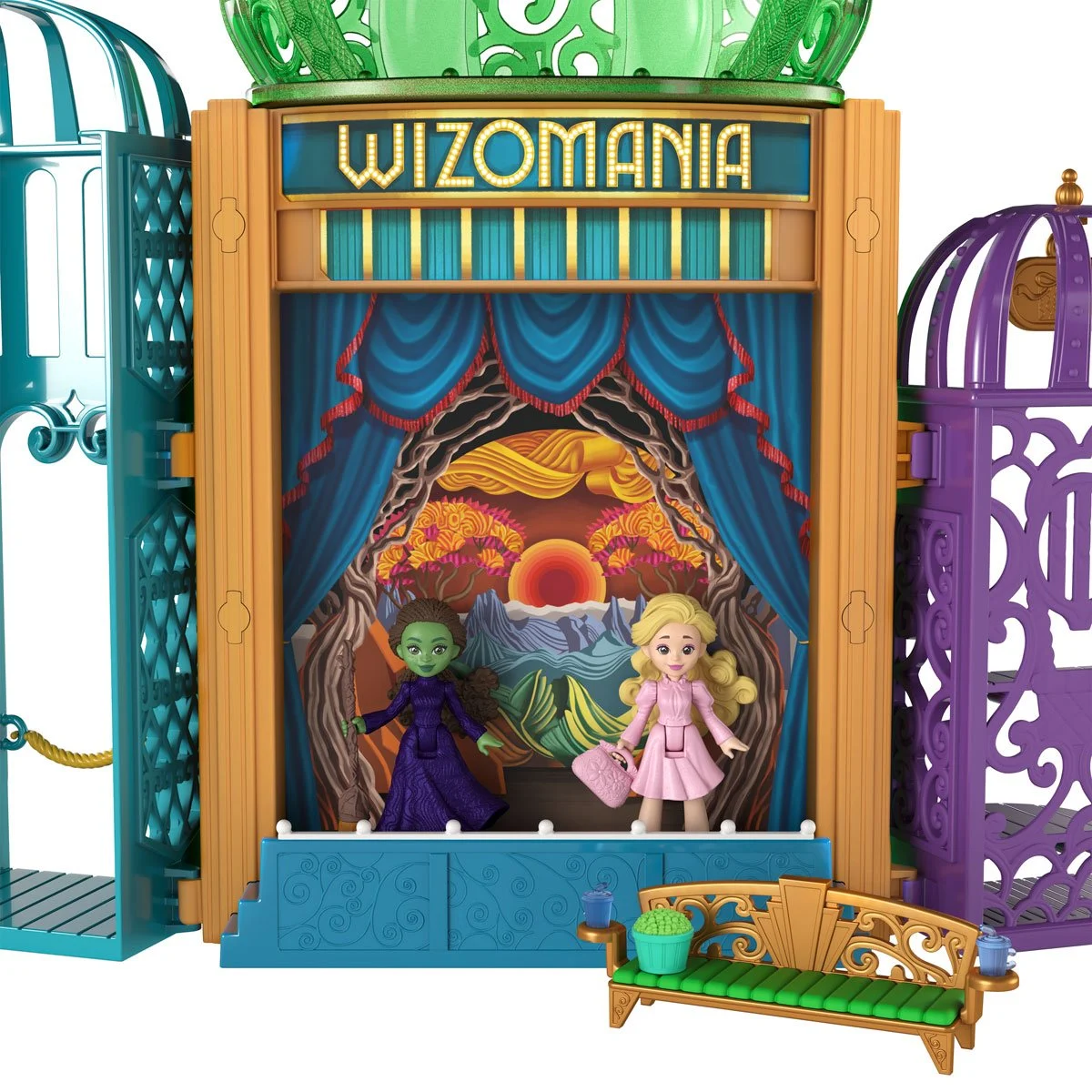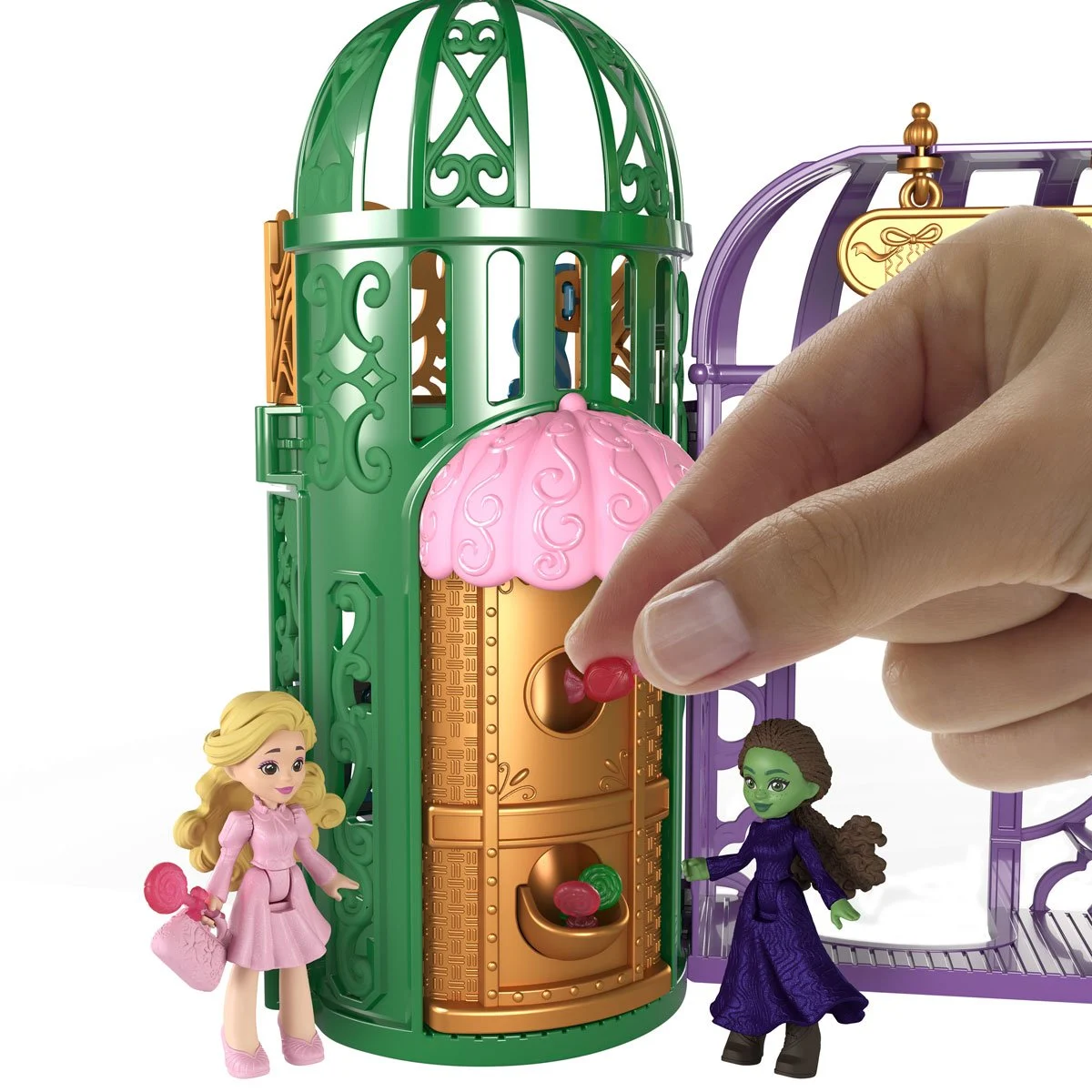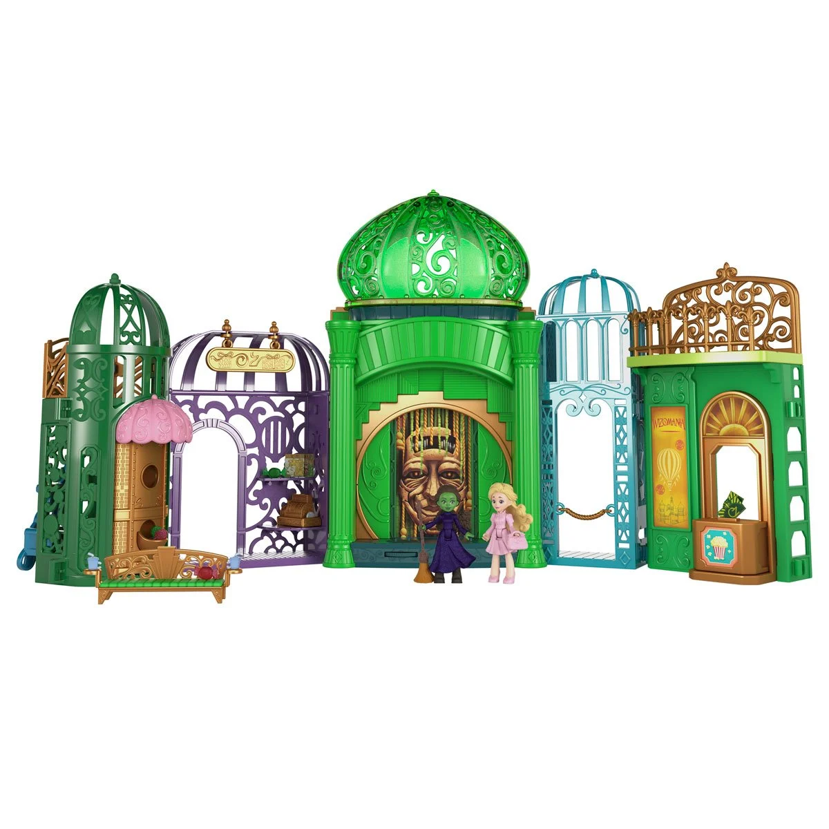 The Wicked Emerald City Mini-Figure Playset includes Elphaba & Glinda dolls, 5 play spaces, and 15 storytelling accessories inspired by the movie.